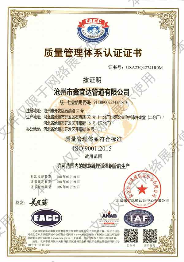 滄州市鑫宜達管道有限公司成立于2003年7月,坐落于滄州經濟開發(fā)區(qū),占地面積40萬平方米,注冊資金1.81億元,是集螺旋鋼管生產、防腐加工以及無縫鋼管、卷板、帶鋼等品類鋼材經營銷售于一體的工貿型企業(yè)。公司現有員工400多人,其中,中高級技術職稱的人員達120余名。 滄州市鑫宜達管道有限公司擁有9條螺旋鋼管生產線和3PE防腐生產線,可生產直徑219--3640mm,壁厚5.5--28mm,最高鋼級X100的各種規(guī)格防腐螺旋鋼管...